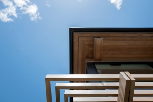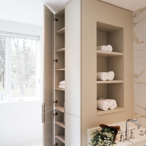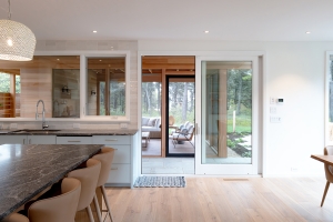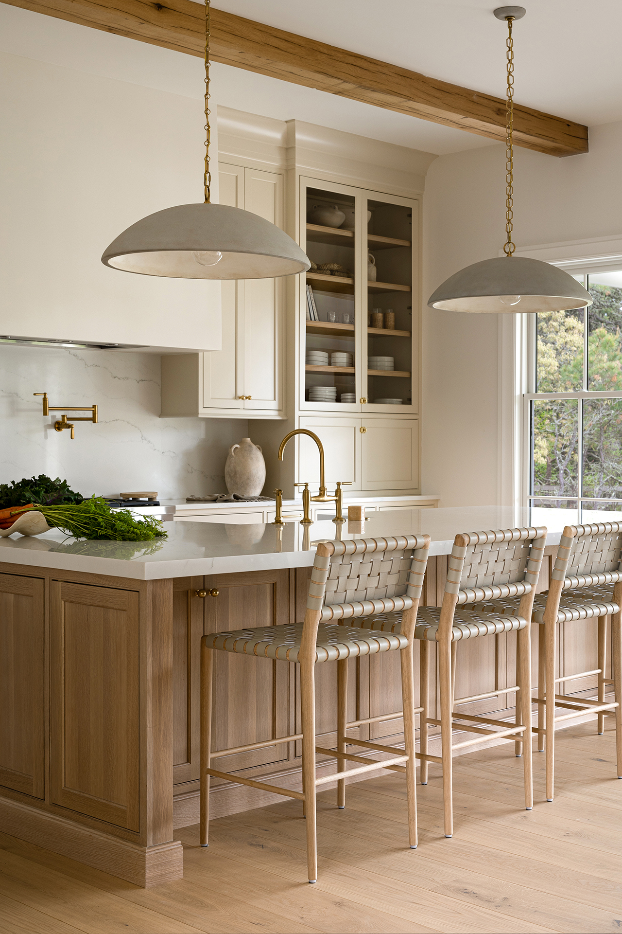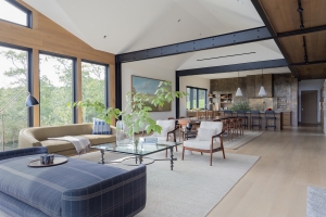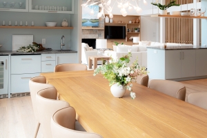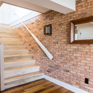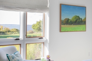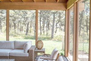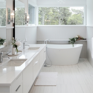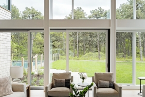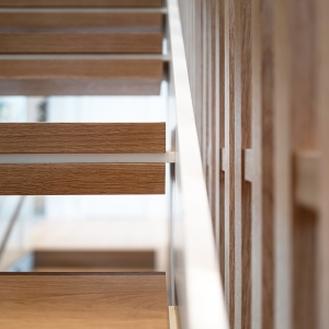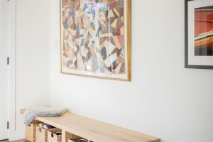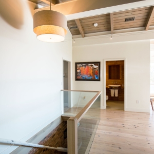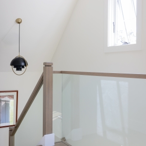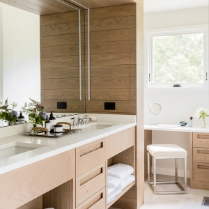 From the custom white-oak slat partition to the ceiling beams, every detail of this Edgartown home creates a sense of calm. The subtle transition from the living area to this bright gallery hall is a masterclass in modern coastal design.